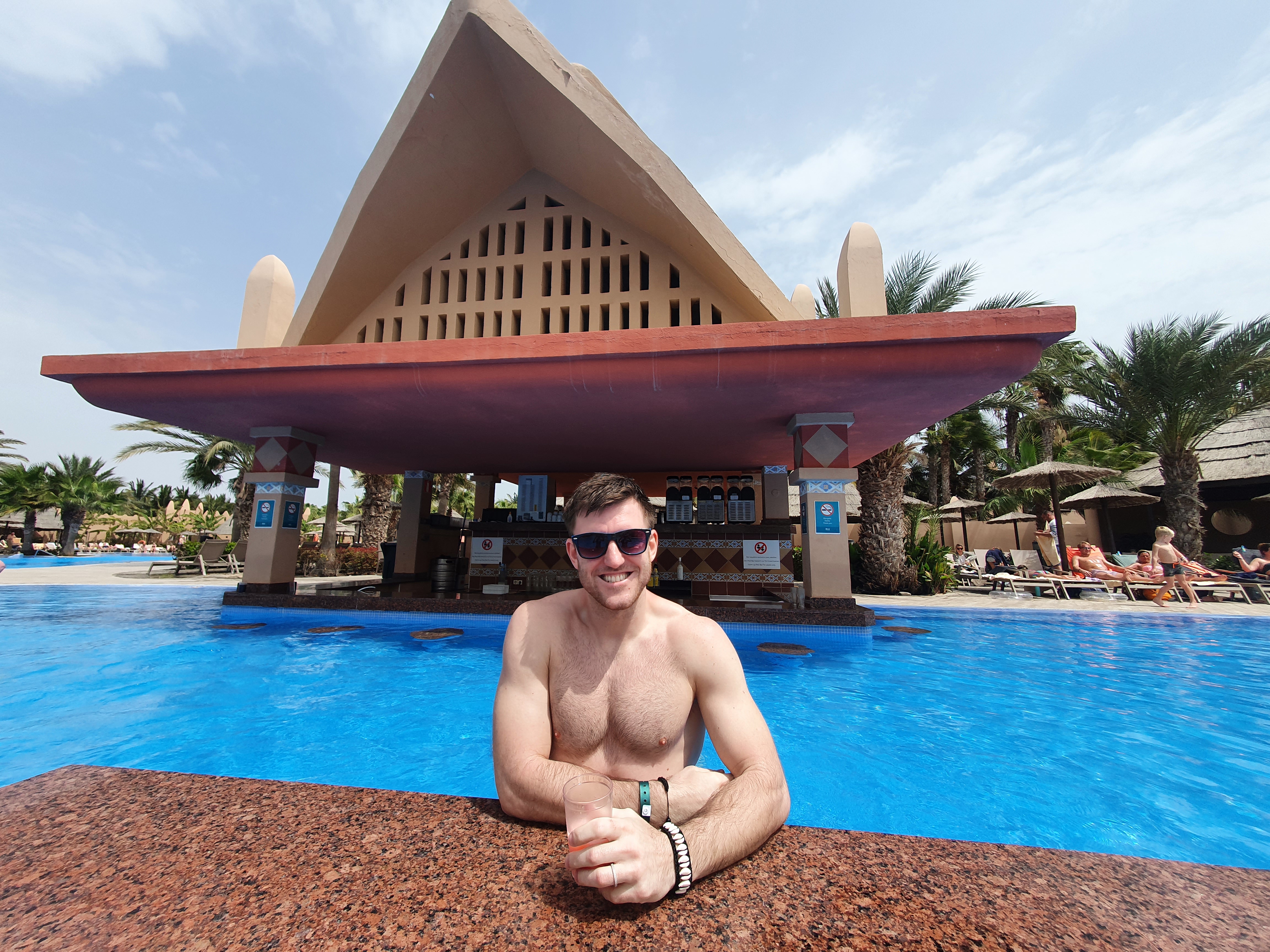Leoš and I wanted to go to the gym, but when we got there we found out that we had to make a reservation beforehand. The gym was too full, but we were able to go in the jacuzzi. However, the water was quite cold. Then we walked back to the pier to make sure we could see more of what the fishermen caught. It was advised to go there before noon. We walked back to the hotel and decided to go in the pool. It was a bit windy and cold, so there weren't that many people at the pool. We were lucky to get photos of just us in the pool because the other days it was quite crowded. After lunch we walked to a beach with black rocks and a surf point. We watched a surfer catching some waves. At night we decided to go out in the town and we met some locals and travelers. It was a fun night out.