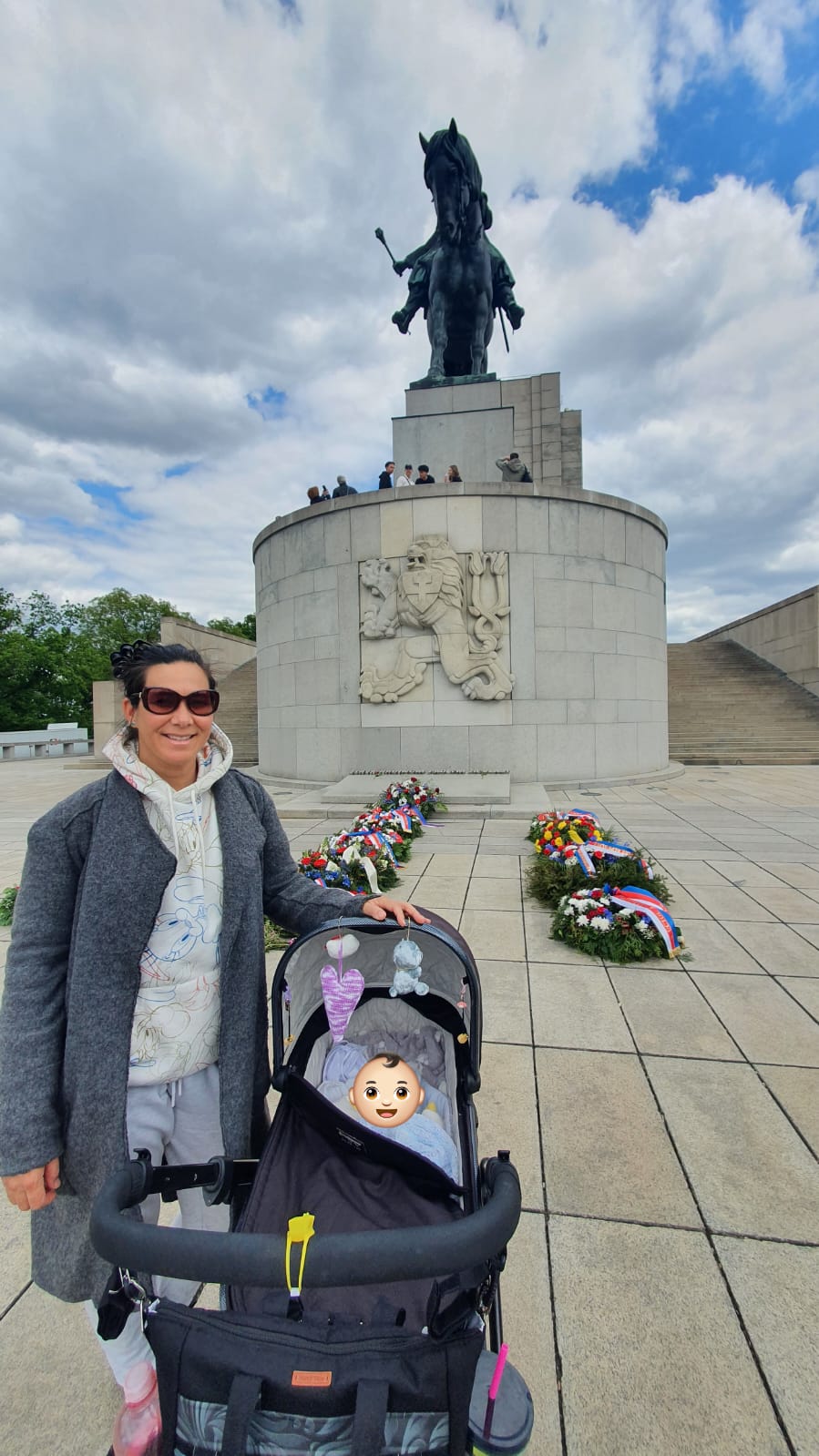 Today was the first time since Amaya was born that I had food from a cafe. It needed to be take out, but I was totally fine with that. It was so nice to be able to get some food that I didn't have to make. I got a coupon from Slevomat from a bagel place. It hit the spot. Today marked the 80th anniversary of the end of WWII. We went to the Vitkov Statue and there were so many people in suits and there was a camera crew. When we got home, we were able to see the live event that happened inside the museum at Vitkov. There were a lot of military people getting awards and relatives of ones who served in the war. It was a nice day.